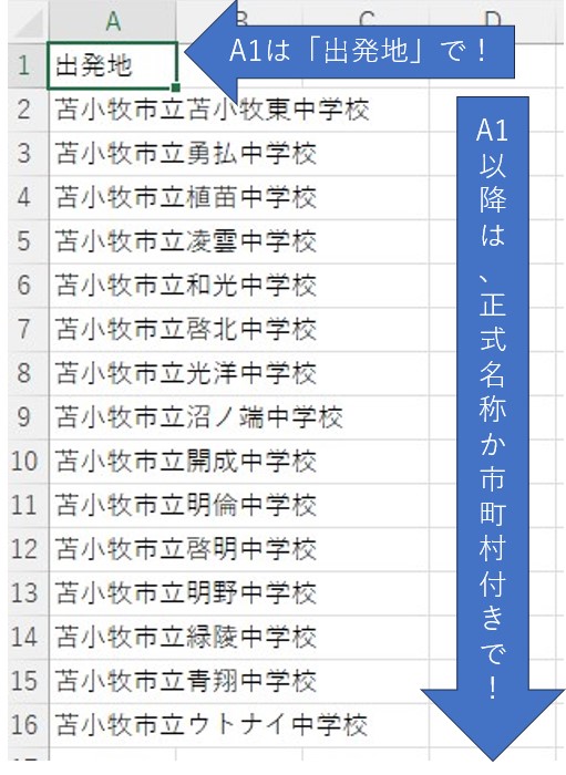 1.A列に出発地を入れたcsvファイル(下記画像)をこちらにアップロードするか、その下にある入力欄に出発地を入れてください